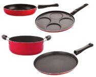 - Package Contents: – Flat Tawa 13 – 29.5cm/Fry Pan 10 – 20cm – 1.1 Ltr/Uttapam (4) – 26.5cm – 4 Cavity/Casserole 14 – 2.4cm – 3.1 Ltr