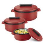 Milton Micronova Jr. Gift Set Inner Stainless Steel Casserole, Set of 3 (380 ml, 775 ml, 1345 ml), Red, BPA Free, Food Grade, Hot and Cold, Microwaverable Steel, Dishwasher Safe, Chapati, Roti