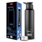 Pigeon Inox Hydra Duo, Dual Cap, Flipper Cap and Fridge Cap in one bottle, Easy to use, Multipurpose all in one bottle 900ml, Black